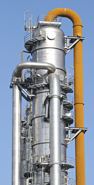 La torre o columna de destilación cuenta con "salidas", llamadas platos, dispuestas a diferentes alturas. En la parte baja de la torre la temperatura es alta pero a medida que los gases van subiendo la temperatura se reduce. Como los diversos componentes del petróleo tienen diferentes temperaturas de condensación, a medida que van subiendo los gases, los componentes se condensan (pasan a estado líquido) y se recogen en las bandejas respectivas.